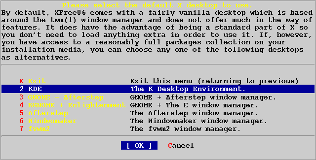 Я выбрал KDE, затем [OK] чтобы выбранный десктоп стал моим оконным менеджером по умолчанию. Вы можете выбрать другой, более удобный или привычный для вас.