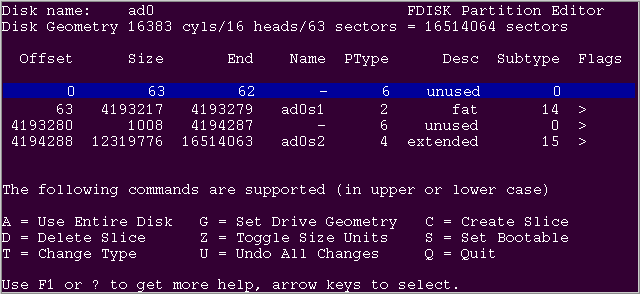 Приведенный ниже внешний вид программы FDISK будет схож с внешним видом подобной программы из OS DOS/Windos. Нажав [F1], вы сможете ознакомиться с важной информацией по пользованию редактором разделов FDISK.