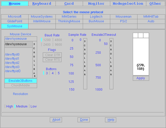 В нашем примере демон мыши уже запущен и добавлена эмуляция "Emulate3Buttons" для нашей мыши. Теперь необходимо щелкнуть по "Apply" и проверить работу мыши. На экране белого цвета будут отбражаться действия мыши если настройки произведены правильно.