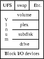 The top object, a vinum volume, implements a virtual disk that provides a standard block I/O layer interface to other parts of the kernel. The bottom object, a vinum drive, uses this same interface to request I/O from physical devices below it.