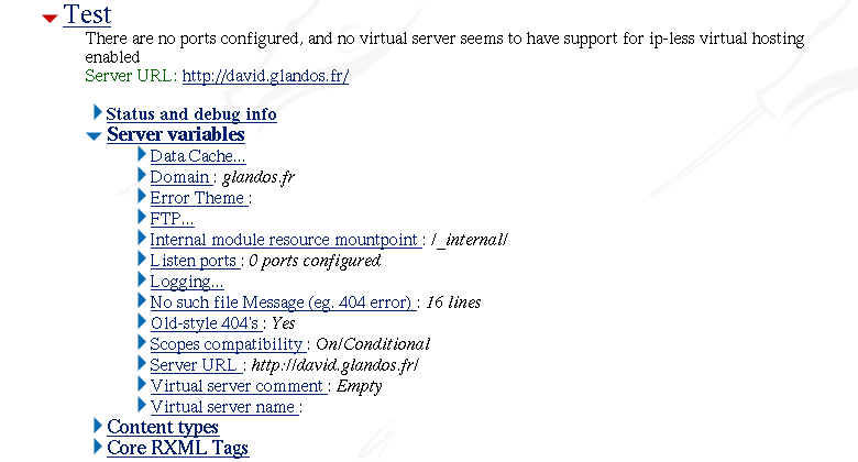 You now have to add another virtual server with the button New Virtual Server at the root of the virtual server tab. Put Virtual host as the server name and choose the Generic server configuration type. Go into Server variables -> Server URL and type http://www.virtualhost.com/. You should see: