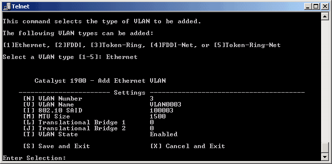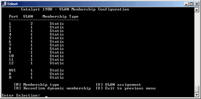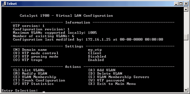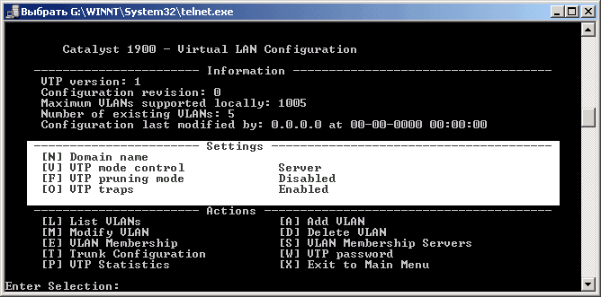 Вначале показывается информация о текущей конфигурации, а затем меню для изменения оной. Для изменения типа VLAN для