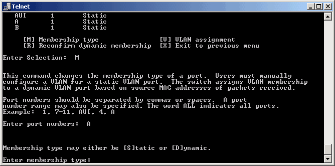 порта(статический или динамический) и спользуется меню Membership type - M:
