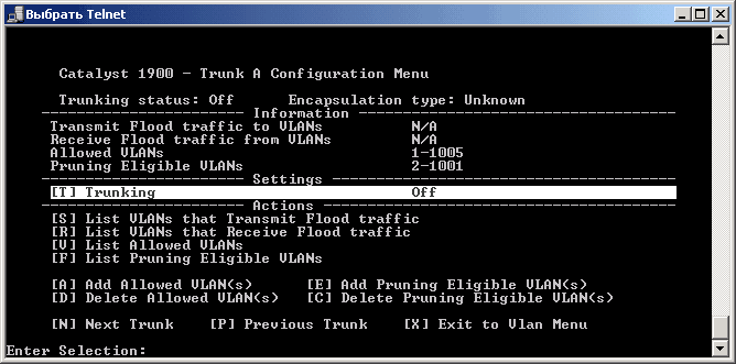 Для настройки trunk портов используйте меню T из главного меню настройки VLAN. Вам покажется следующее меню. Trunk портами
