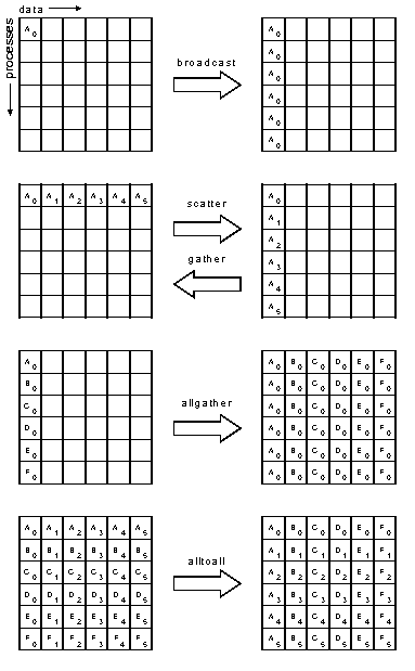 Коллективные - должны быть вызваны ВСЕМИ ветвями-абонентами того коммуникатора, который передается им в качестве аргумента. Несоблюдение для них этого правила приводит к ошибкам на стадии выполнения программы (как правило, к повисанию).
