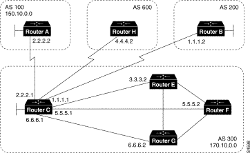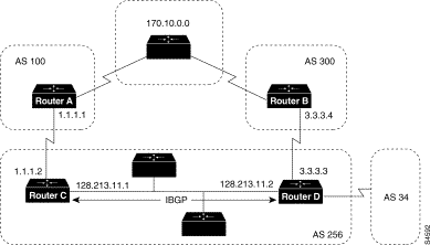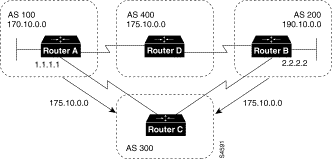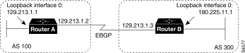 !Router B loopback interface 0 ip address 180.225.11.1 router bgp 300 neighbor 129.213.1.1 remote-as 100 neighbor 129.213.1.1 ebgp-multihop neighbor 129.213.1.1 update-source loopback 0