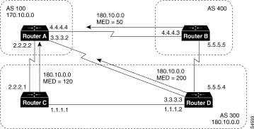 !Router A router bgp 100 neighbor 180.10.30.1 remote-as 100 neighbor 190.10.50.1 remote-as 100 neighbor 170.10.20.2 remote-as 300 network 150.10.0.0 !Router B router bgp 100 neighbor 150.10.30.1 remote-as 100 neighbor 175.10.40.1 remote-as 400 neighbor 180.10.30.1 remote-as 100 network 190.10.50.0 !Router C router bgp 400 neighbor 175.10.40.2 remote-as 100 network 175.10.0.0 !Router D router bgp 100 neighbor 150.10.30.1 remote-as 100 neighbor 190.10.50.1 remote as 100 network 190.10.0.0
