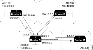 ! Router D router bgp 300 neighbor 192.208.10.2 remote-as 200
