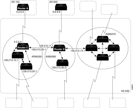 !Router E hostname RouterE ! interface loopback 0 ip address 200.200.10.1 255.255.255.0 interface serial 0 ip address 195.211.10.2 255.255.255.252 ! interface serial 1 ip address 128.213.63.6 255.255.255.252 ! router bgp 400 network 200.200.10.0 aggregate-address 200.200.0.0 255.255.0.0 summary-only neighbor 128.213.63.5 remote-as 200 neighbor 195.211.10.1 remote-as 500
