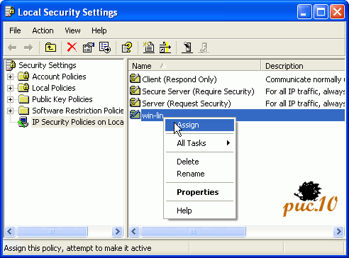 В linux'e даем команду /etc/init.d/ipsec start. В windows'е щелкаем правой кнопкой мыши на наше вновь созданное правило и активируем его, выбрав пункт Assign, рис.10