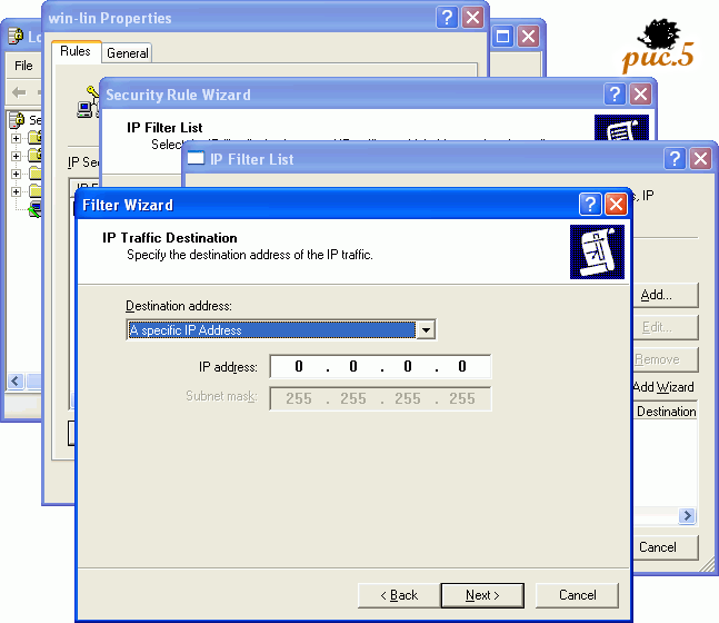 Выбираем имя фильтра и нажимаем Add, после чего появляется IP Filter Wizard. На вкладке IP Traffic source оставляем выбранным вариант My IP Address, а на вкладке IP Traffic Destination выбираем A specific IP Address, как это показано на рис.5.