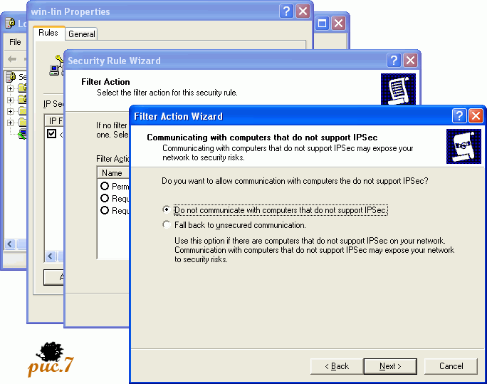 На вкладке Filter Action, которая служит для определения действий, происходящих при попытках зашифрованных/не зашифрованных соединений, создаем новый фильтр, нажав на кнопку Add. На вкладке Filter Action Name задаем имя фильтра. На вкладке Filter Action General Option оставляем Negotiate security. На вкладке Communicating with computer that do not support IPSec оставляем выбранной опцию Do not communicate with computer that do not support IPSec, как это показано на рис.7.