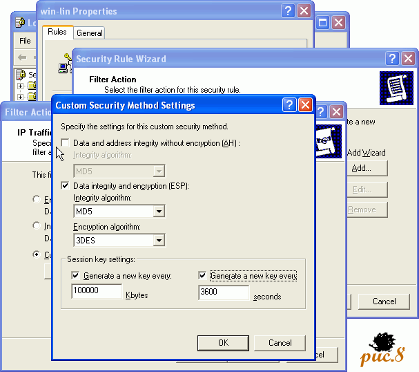 На следующей вкладке IP Traffic Security выбираем пункт Custom и нажимаем на кнопку Settings, и выбираем, соответственно, алгоритм ответственный за целостность данных MD5, а алгоритм ответственный за шифрование 3DES - рис.8. Session key settings - добавить по вкусу, однако, лучше не перебарщивать. Создаем фильтр и выбираем его на вкладке Filter Action. И, наконец то, создаем правило безопасности.