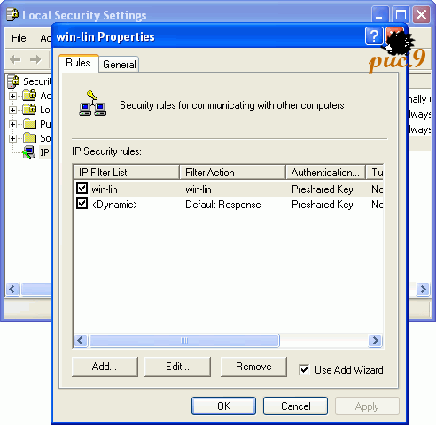 Если вы все правильно сделали (должно получиться что-то вроде рис.9) и запустили IPSEC на машине с linux, то у вас скоро все заработает. Закрываем вкладку <Имя> Properties, нажав на кнопку Close.