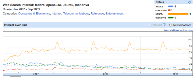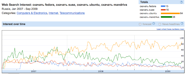 Рис. 2. Сравнение частоты российских поисковых запросов по загрузке Fedora, SUSE, Mandriva и Ubuntu