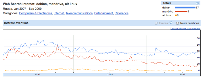 Рис. 4. Сравнение частоты российских поисковых запросов по Debian, Mandriva и ALT Linux