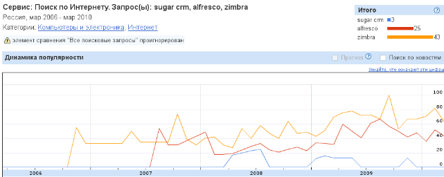 Рассмотрение частоты российских поисковых запросов по свободным решениям для бизнеса (Sugar CRM, Alfresco, Zimbra) говорит об относительно недавнем появлении интереса аудитории к данным продуктам и о наличии роста интереса. (Рис 5)