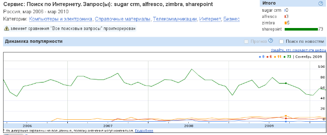 Сравнение же количества поисковых запросов по данным продуктам с Microsoft Sharepoint (взятым для примера, как наиболее популярный продукт, альтернативой которого является Alfresco), показывает, что интерес российской интернет-аудитории к перечисленным свободным продуктам в 15-20 раз ниже, чем к Sharepoint (рис 6.)