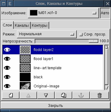 Маленькое отступление: основную работу по закраске я выполняю в негативе, не знаю почему, но мне так удобней. В позитиве, обычно, я делаю только окончательную подгонку и доводку. Слой с черным фоном помещаем между исходным изображением и контурным рисунком, а остальные слои поверх контурного изображения. Раскладка слоев будет выглядеть примерно вот так: