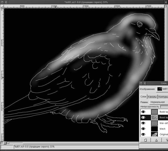 Заметьте, что контуры деталей оперения мы не трогаем! Далее, склеиваем все слои и получившиеся изображение инвертируем, наконец-то переходя к позитиву.