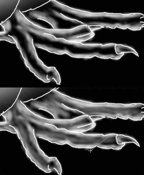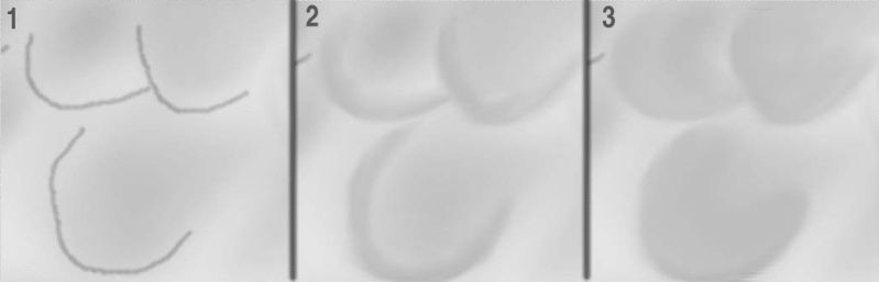 Потом берем в руки "палец" и выправляем неровности нашей закраски. Мазки делаются вдоль границ тех частей объекта, форму которых мы хотим подчеркнуть. Размер "пальца" должен быть не менее размера "аэрографа" примененного на данном участке изображения. Получается что-то вроде этого: