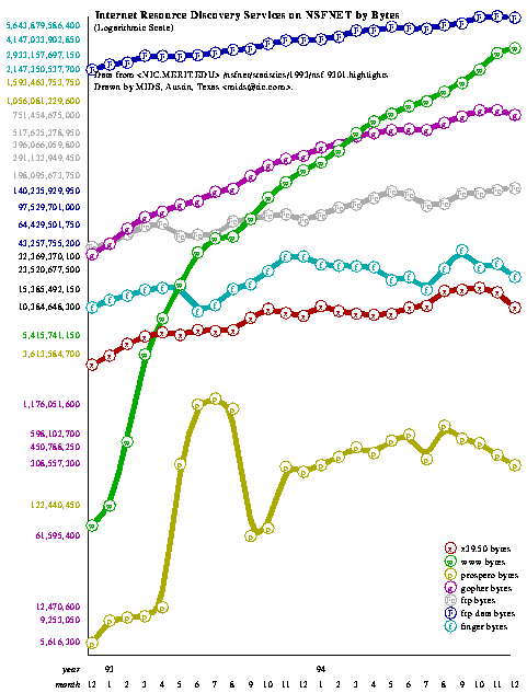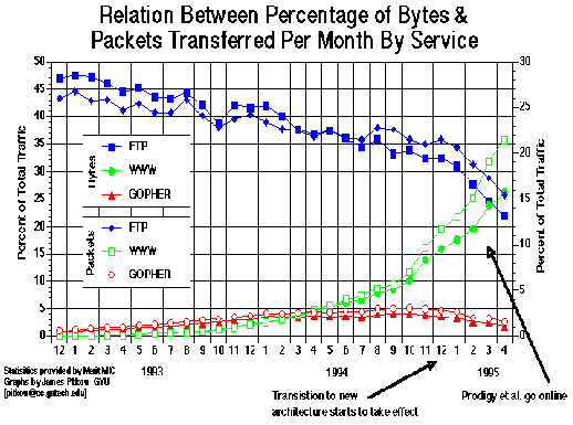 В настоящее время назначение FTP-архивов существенно расширилось. Несмотря на то, что на арену сетевого обмена выходят все новые средства и технологии, вряд ли они смогут потеснить FTP-обмен в рамках существующих стандартов TCP/IP. Если обратиться к хорошо известной картинке распределения трафика по информационным сервисам Internet (рисунок 1.1), то легко можно обнаружить, что два протокола FTP и Prospero в совокупности довольно сильно превышают трафик HTTP.