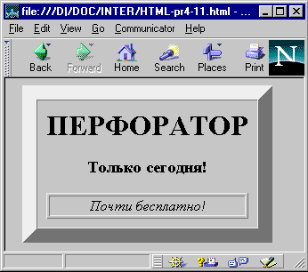 <HTML> <BODY> <CENTER> <TABLE CELLPADDING=10 CELLSPACING=0 BORDER=16> <TR> <TD ALIGN=CENTER> <H1>ПЕРФОРАТОР</H1> <H3>Только сегодня!</H3> <TABLE BORDER WIDTH=100%> <TR><TD ALIGN=CENTER><I>Почти бесплатно!</I></TD> </TR> </TABLE> </TD> </TR > </TABLE> </CENTER > </BODY> </HTML>