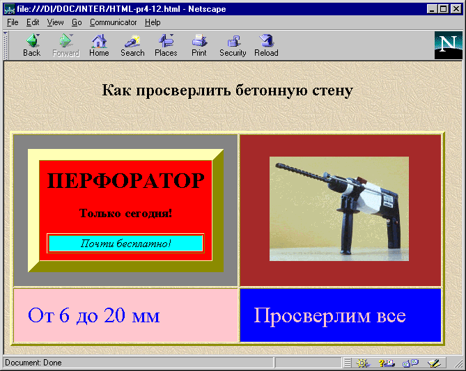 <HTML> <BODY BACKGROUND="bgr.gif" BGCOLOR="YELLOW" > <CENTER> <TABLE BORDER=3 CELLPADDING=20> <CAPTION ALIGN=TOP><H2>Как просверлить бетонную стену</H2></CAPTION> <TR> <TD BGCOLOR=GRAY> <TABLE CELLPADDING=10 CELLSPACING=0 BORDER=16> <TD BGCOLOR=RED ALIGN=CENTER> <H1>ПЕРФОРАТОР</H1> <H3>Только сегодня!</H3> <TABLE BORDER WIDTH=100%> <TR> <TD BGCOLOR=AQUA ALIGN=CENTER><I>Почти бесплатно!</I></TD> </TR> </TABLE> </TABLE> <TD WIDTH=50% BGCOLOR=BROWN ALIGN=CENTER> <IMG SRC="perfor1.gif" WIDTH=200 HEIGHT=150> </TD> </TR> <TR> <TD BGCOLOR=PINK> <FONT SIZE=6 COLOR=BLUE>От 6 до 20 мм</FONT> </TD> <TD BGCOLOR=BLUE> <FONT SIZE=6 COLOR=PINK>Просверлим все</FONT> </TD> </TR> </TABLE> </CENTER > </BODY> </HTML>