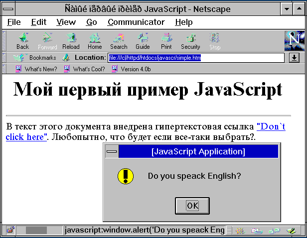 В данном примере среди текста документа расположена гипертекстовая ссылка "Don`t click here". Если ее выбрать при просмотре (кликнуть мышкой), то на экране появится окно-предупреждение с вопросом: "Do you speak English?".