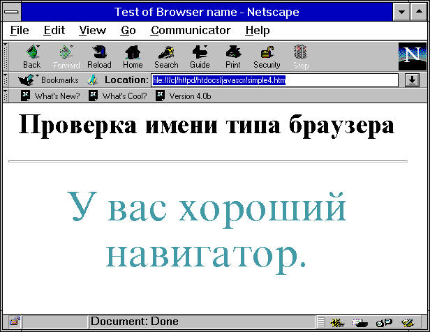 Вообще говоря, проверить тип программы просмотра можно на сервере протокола HTTP и передать программе просмотра уже готовую страницу без условной генерации ее содержания. Но это возможно только в том случае, когда автор страницы имеет возможность программировать на машине где установлен сервер и имеет возможность администрировать этот сервер. В ряде случаев, когда место под Website арендуется и в договоре аренды нет пункта, обеспечивающего управление ресурсами сервера, в этом случае программы с условной генерацией содержания страниц бывают чрезвычайно полезными. Другой случай - это работа в локальном режиме без сервера. Здесь JavaScript является единственным средством управления просмотром. Существует еще ряд случаев, когда применение контейнера SCRIPT в теле документа является вполне оправданным, но на них мы остановимся позже в контексте решения конкретных задач управления сценариями просмотра.