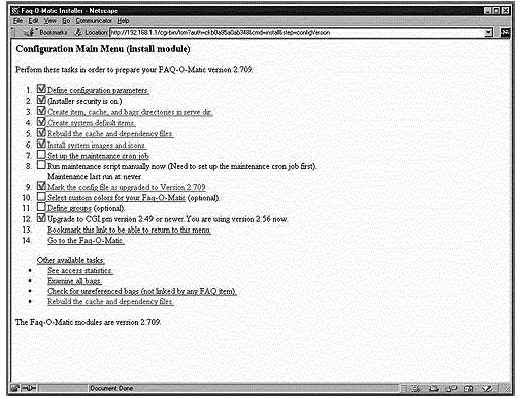 Шаг 2После окончания конфигурирования "Define configuration parameters", вы должны закончить настройку остальной части FAQ-O-Matic, чтобы иметь возможность использовать его так, как описано в главном меню.