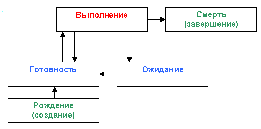 Готовность - это тоже пассивное состояние, процесс тоже заблокирован, но в отличие от состояния ожидания, он заблокирован не по внутренним причинам (ведь ожидание ввода данных - это внутренняя, "личная" проблема процесса - он может ведь и не ожидать ввода данных и свободно выполняться - никто ему не мешает), а по внешним, независящим от процесса, причинам. Когда процесс может перейти в состояние готовности? Предположим, что наш процесс выполнялся до ввода данных. До этого момента он был в состоянии выполнения, потом перешел в состояние ожидания - ему нужно подождать, пока мы введем нужную для работы процесса информацию. Затем процесс хотел уже перейти в состояние выполнения, так как все необходимые ему данные уже введены, но не тут-то было: так как он не единственный процесс в системе, пока он был в состоянии ожидания, его "место под солнцем" занято - процессор выполняет другой процесс. Тогда нашему процессу ничего не остается как перейти в состояние готовности: ждать ему нечего, а выполняться он тоже не может.