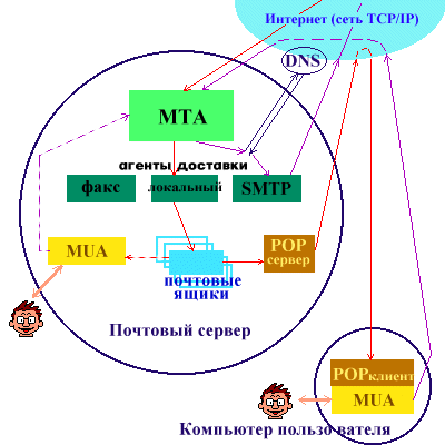 Теперь рассмотрим исходящее сообщение (сиреневые стрелки) от ivanov@cts.vvsu.ru к bg@aquarium.ru. Сообщение поступает к транспортному агенту двумя способами в зависимости от того, где работает Иванов. Если Иванов работает на почтовом сервере, то его MUA напрямую обращается к транспортному агенту и передает ему сообщение для БГ (сиреневый пунктир). Если же Иванов работает на другом компьютере, то его MUA связывается с транспортным агентом через сеть по протоколу SMTP. (Опять, так как протокол SMTP работает поверх TCP/IP, нет никаких ограничений на местоположение компьютера Иванова - сиреневая линия на рисунке, исходящая от комьютера Иванова, в общем случае проходит через Интернет.)