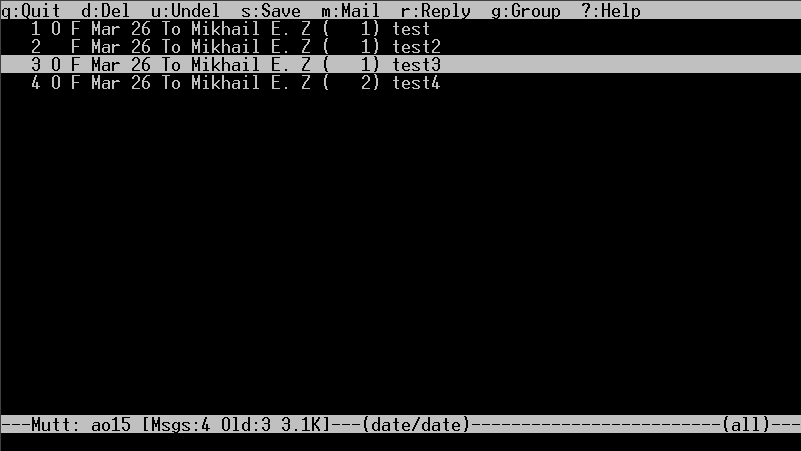Сразу после установки можно убедиться, что mutt вполне работоспособен даже с конфигурацией по-умочанию. Для этого выполним команду: