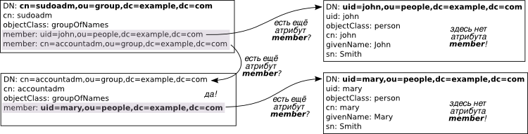Сначала мы берём DN uid=john. Эта запись не имеет атрибута member, поэтому дальше мы не идём. Переходим к cn=accountadm. У этой записи есть атрибут member, содержащий uid=mary. Однако запись uid=mary, не имеет атрибута member, поэтому здесь мы снова останавливаемся. В конце операции получаем:
