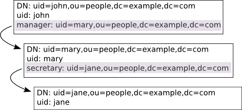 В этом примере, Jane - секретарь Mary, которая, в свою очередь, является менеджером John. Все эти взаимоотношения определяются атрибутами manager и secretary, оба из которых имеют синтаксис distinguishedName (то есть, полные DN). Таким образом, при получении доступа к записи uid=john, набор this/manager/secretary становится {"uid=jane,ou=people,dc=example,dc=com"} (следуя по ссылкам, как показано ниже):