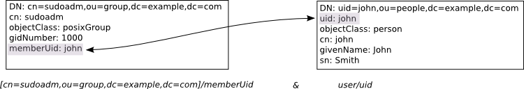 dn: cn=sudoadm,ou=group,dc=example,dc=com cn: sudoadm objectClass: groupOfNames member: uid=john,ou=people,dc=example,dc=com member: cn=accountadm,ou=group,dc=example,dc=com dn: cn=accountadm,ou=group,dc=example,dc=com cn: accountadm objectClass: groupOfNames member: uid=mary,ou=people,dc=example,dc=com