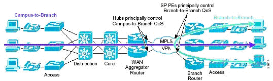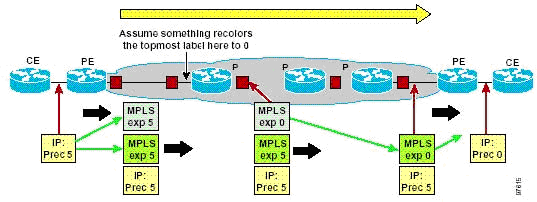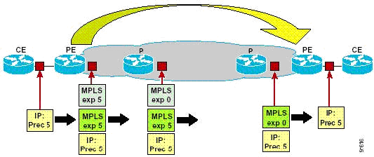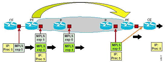 Как упоминалось ранее, нет необходимости поддерживать в магистрали то же количество DiffServ классов, что и на границе сети. Один из примеров реализации - это использование трех DiffServ классов в магистрали и пяти на пограничных устройствах (РЕ).