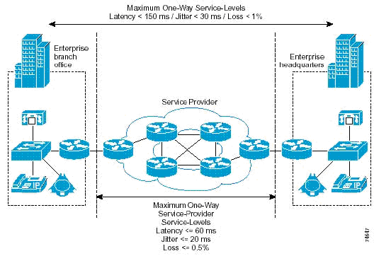2. Задержка более 200 мсек может вызвать деградацию качества голосовой связи. Если общая задержка в канале становится слишком большой, разговор по телефону начинает напоминать переговоры по спутниковому каналу связи или по симплексному радиоканалу. В стандарте Международного Союза Электросвязи для технологии VoIP (G.114) говорится, что задержка величиной в 150 мсек в одном направлении является приемлемой для качество голосовой связи. Было продемонстрировано, что разница в качестве голоса между сетями с задержкой в 150 мсек и 200 мсек является незначительной и практически незаметной для пользователя. Cisco рекомендует ориентироваться на ITU стандарт 150 мсек, но если существуют ограничения не позволяющие добиться такого бюджета, то размер задержки может быть увеличен до 200 мсек без значительной деградации качества связи.