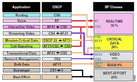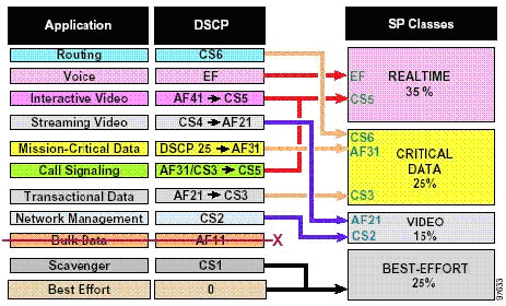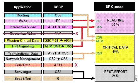 Примечание N1: В "Базовых Основах QoS" рекомендуется маркировать голосовую сигнализацию с помощью CS3. Однако в настоящий момент, Cisco IP телефоны маркируют сигнализацию как AF31. Миграция от AF31 к CS3 уже запланирована, но как временное решение рекомендуется зарезервировать AF31 и CS3 для сигнализации и использовать DSCP 25 для локальных критичных приложений данных. По завершении миграции следует применять рекомендации "Базовых Основ QoS" по маркировке сигнализации с помощью CS3 и локальных критичных приложений с помощью AF31. Эти рекомендации по маркировке более соответствуют RFC2597 и RFC2474.