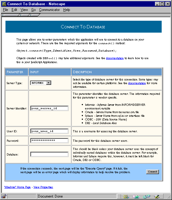 При использовании сервера Informix Вы обязаны иметь Netscape Enterprise Server. Вы не можете получить доступ к Informix из Netscape FastTrack Server.