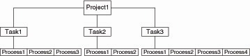 Для того чтобы четко определить функциональность используемых рабочих областей в операционной системе Solaris их гипотетически разделили на два основных типа: project(проекты) и task(задачи). Проекты представляют собой совокупность распределенных по сети задач, а сами задачи включают в себя рабочие процессы. Данная структура наглядно представлена на следующем рисунке: