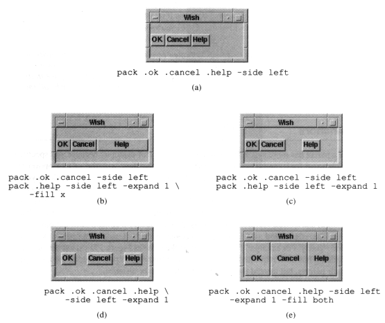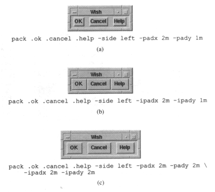 Опция -side. На примере (см. Рисунок 2 а) показан, результат выполнение команды pack .ok .cancel .help. -side left. Если во время выполнения программы растянуть окно, то оно будет выглядеть как на Рисунке 2b.