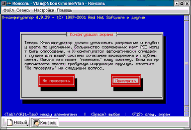 Первым появится приветствие. Следующее окно содержит сведения об обнаруженном видеоустройстве, X-сервере и драйвере. Затем предлагается определиться с монитором. Следует выбрать строку IBM 9513 T55A TFT. Допустимые диапазоны частот вертикальной и горизонтальной разверток выбранного типа составляют 30≈61 кГц и 56≈75 Гц, что полностью соответствует рабочим характеристикам ЖК-матрицы данного ноутбука. После этого откроется окно, предлагающее провести тестирование и определить оптимальное разрешение и глубину цвета для ноутбука. Когда вы нажмете кнопку ╚Проверить╩, экран начнет мигать и переключаться в различные режимы. В результате этого тестирования программа предложит использовать разрешение экрана 1024х768 с количеством цветов 16 бит на пиксел. Принять это предложение можно, нажав кнопку ╚Использовать настройки по умолчанию╩. Затем появится предупреждение о том, что утилита запустит Х-сервер для проверки созданной конфигурации. Откроется графический экран. Потребуется подтверждение того, что изображение функционирует нормально (кнопка ОК). Программа закроет этот экран и, вернувшись в консольный режим, предложит автоматически запускать Х-сессию при каждой загрузке. Для загрузки операционной системы в графическом режиме придется согласиться, иначе в следующий раз ноутбук загрузится в режиме 3 (текстовом). После этого все сделанные настройки сохранятся и программа закончит свою работу.