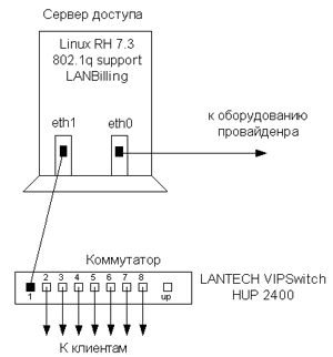 Предполагается, что клиент (потребитель) будет подключен посредством кабеля "витая пара" в выделенный порт коммутатора. На стороне клиента кабель может подключаться как в маршрутизатор клиента, рабочую станцию так и в хаб или коммутатор. Поддержки VLAN на стороне клиента не требуется. В качестве основного коммутатора для тестирования подобной конфигурации мы выбрали устройство Lantech VIPSwitch HUB 2400. Как оказалось в последствии, выбор был не совсем удачным, но об этом позже. Устройств, которые достойно поддерживают работу с VLAN достаточно много, однако каждый производитель интерпретирует стандарт по своему, и в связи с этим реальная функциональность у разных устройств может существенно отличаться от того, что декларировано стандартом. Безусловно одна из лучших реализаций 802.1Q в коммутаторах от CISCO - Catalyst 2950-12 или 24 портовые коммутаторы, уже сегодня их можно приобрести по цене чуть ниже чем 1000 у.е. На сегодняшний день также существует линейка устройств Huawei (вся информация об этой торговой марке доступна через российский web сайт компании www.huawei.ru). Маршрутизаторы и коммутаторы Huawei по функциональности и математическому обеспечению практически идентичны устройствам CISCO, однако в 1.5 - 2 раза дешевле в связи с тем, что на российском рынке марка практически неизвестна. На наш взгляд это продукция будет пользоваться серьезным спросом ближайшее время, учитывая агрессивность цен и амбиции компании на российском рынке. Также имеет смысл обратить внимание на продукцию Allied Telesyn, мы не тестировали этот брэнд, однако по декларированным характеристикам устройство AT-8124XL также подходит для решения нашей задачи. На рис.1 изображена структурная схема системы доступа одного из наших клиентов, применяющих разделение клиентов посредством VLAN.