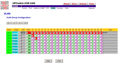 Интерфейс настройки интуитивно понятен. По горизонтали указаны порты устройства, по вертикали возможные номера VLAN. Идея настройки заключается в том, что бы назначить каждый порт (потребитель) в его собственный VLAN, а также в VLAN к которому подключен сервер доступа. Таким образом, сервер доступа будет присутствовать сразу во всех VLAN.