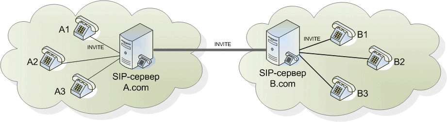 Если пользователь A1@a.com захочет позвонить пользователю B1@b.com, то он передаст запрос INVITE B1 своему прокси-серверу, который перенаправит вызов прокси-серверу b.com абонента B1.