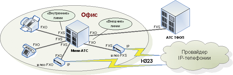 n FXO (Foreign eXchange Office) - аналоговый интерфейс абонентских устройств телефонных станций. Устройства с таким интерфейсом подключаются к интерфейсу FXS. Так те же самые факсовые аппараты, телефоны, модемы реализуют интерфейс FXO. Существует такое простое правило - если есть провод, соединяющий два аналоговых устройства телефонии, то с одной стороны этого провода должен быть FXS (АТС), а с другой - FXO (телефон). Таким образом, шлюзы с интерфейсом FXO подключаются вместо телефона. С их помощью можно организовать связь с ТФОП или предоставить доступ к IP-телефонии, используя "внутренние" (более дешевые) линии мини-АТС. Так как шлюзы FXO фактически "эмулирует телефон", зачастую для них бывает необходима настройка "отбоя". Для того чтобы шлюз "клал трубку", нужно научить его понимать сигнал "занято" той мини-АТС, к которой он подключен.