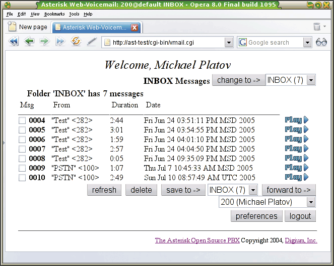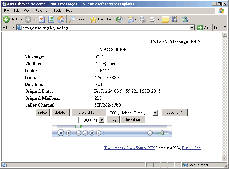 Пользователей linux-систем придется немного расстроить - воспроизведение в браузере через плагин (кнопка play) скорее всего не заработает, и для прослушивания сообщений придется загружать файлы на компьютер (кнопка download), а вот с Windows все нормально (см. рис. 3).