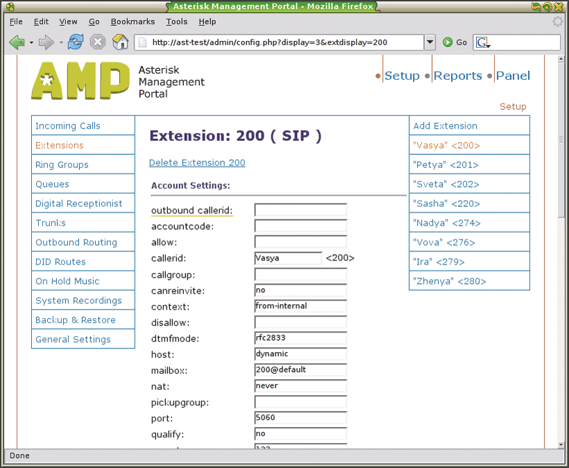 Перед нами предстанут три раздела меню: настройка (Setup), отчеты (Reports) и панель FOP. Как следует из названия, для конфигурации системы используется Setup. Возможные действия в этом разделе перечислены в меню слева. Первым делом перейдем в подраздел Extensions и создадим несколько учетных записей пользователей (см. рис. 8).